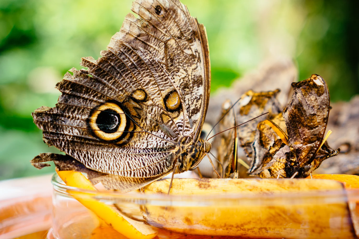 you do not necessarily need a macro lens to capture butterflies. just attract their attention with a few sweet fruits and you'll have enough time to adjust the frame.